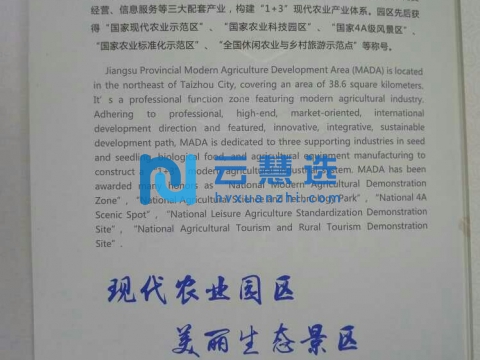 江苏省现代农业综合开发示范区(以下简称园区)位于泰州市主城区东北郊,东连国家4A级景区溱湖湿地公园,西接国家4A级景区凤城河风景区,规划总面积38.6平方公里。2010年7月,被江苏省政府批准为“省级现代农业产业园区”。建区以来,园区以科学发展观为指导,坚持“生态立园、科技兴区,特色为先、效益为本”的发展理念和“市场化、高端化、产业化、现代化”的发展路径,着力培育提升“专业功能、示范引领”核心竞争力和区域影响力,努力建设农业现代化的先行区、农业产业化的集聚区、农业科技创新的示范区、新农村建设的样板区和生态旅游的目的地,打造长三角地区的“生态后花园、健康产业区”。园区围绕“1+3”现代农业产业体系,以 现代农业产业化为主导产业,做大做强、做优做特集科技研发、优质种源、设施栽培、特色养殖、精深加工、物流配送于一体的现代农业产业链,高品位、高起点发展生态旅游、商贸经营和信息服务等配套产业。园区产业发展重点布局“五区”,即现代农业展示区、仓储物流区、农副产品精深加工区、集中居住区和行政科研商贸服务区。